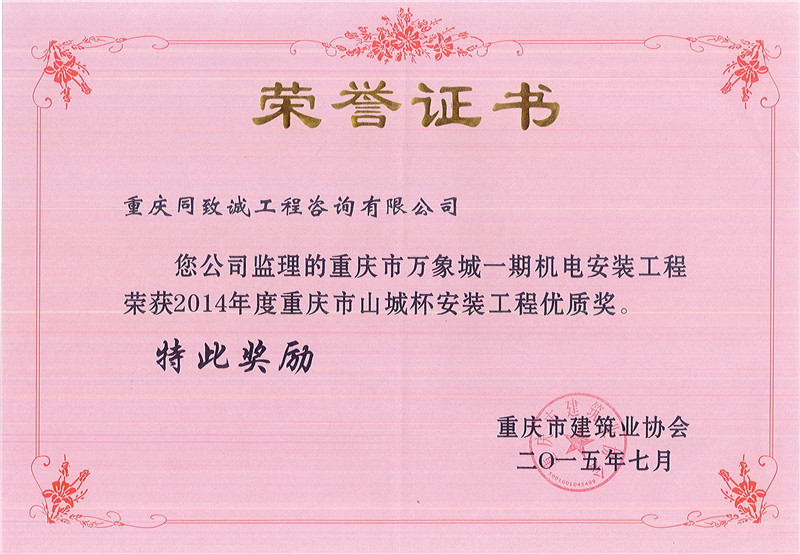 重慶市萬象城一期機電安裝工程榮獲2014年度重慶市山城杯安裝工程優質獎
