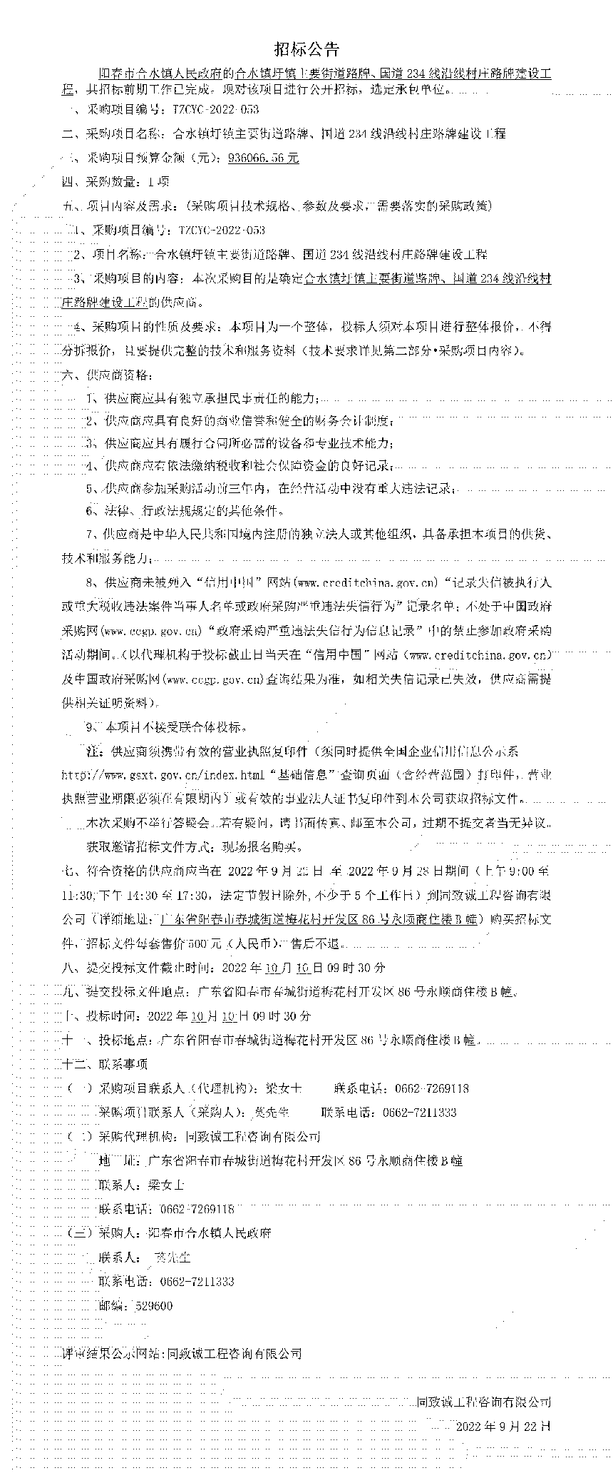 合水鎮(zhèn)圩鎮(zhèn)主要街道路牌、國道234線沿線村莊路牌建設(shè)工程